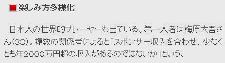There're also world-class Japanese players. The leader is Daigo Umehara (age 33). According to several people who are in the business "With the income from the sponsors, he should make at least over 20 million yen ($195.9k) a year."